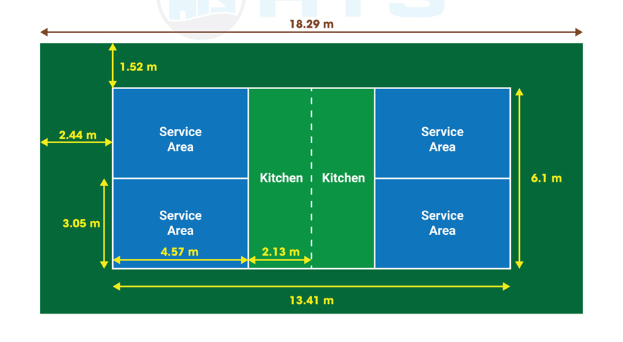 - Sân được chia đôi bởi lưới cao 0.86m ở giữa, với các khu vực: kitchen zone (non-volley zone), service areas, baseline...