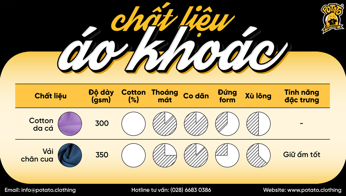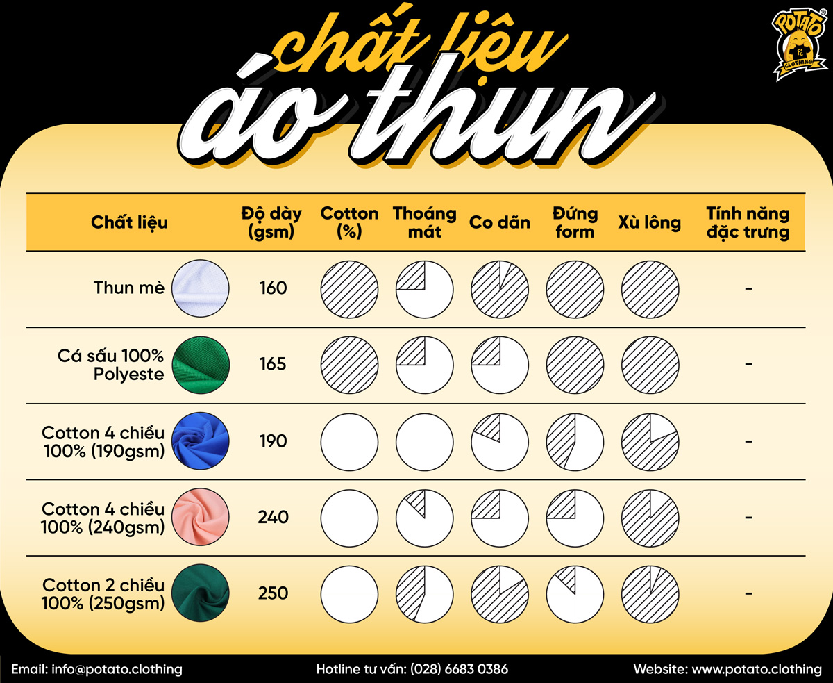 Dưới đây là bảng so sánh những ưu điểm, nhược điểm của các chất liệu vải thun chất lượng được dùng tại Potato Clothing. Chúc bạn chọn được chất liệu vải phù hợp với nhu cầu sử dụng của mình.