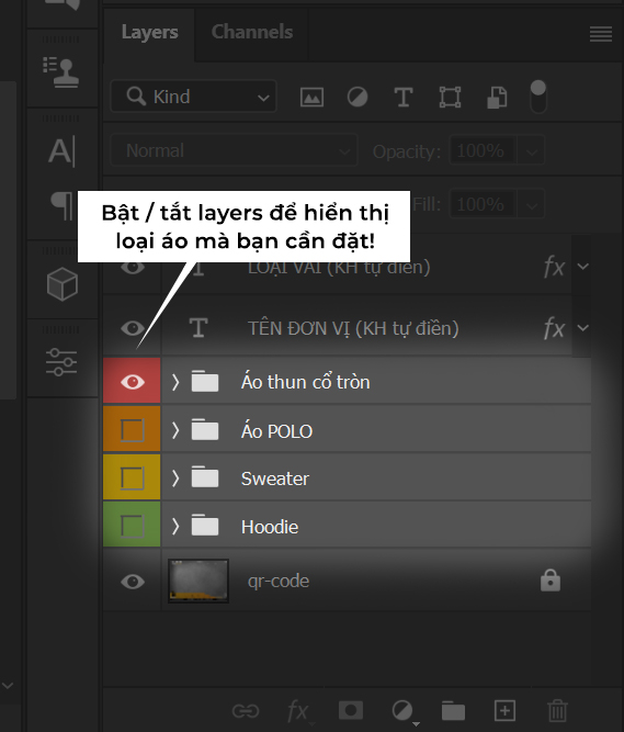 Bạn có thể dễ dàng nhìn thấy các Layer như sau ở góc bên phải màn hình của bạn. Hãy bật/tắt con mắt để hiển thị loại áo mà bạn cần đặt nhé.
