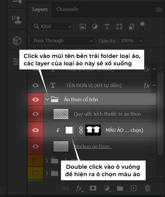 - Bấm vào mũi trên ở bên trái folder loại áo, các layer của loại áo này sẽ xổ xuống.