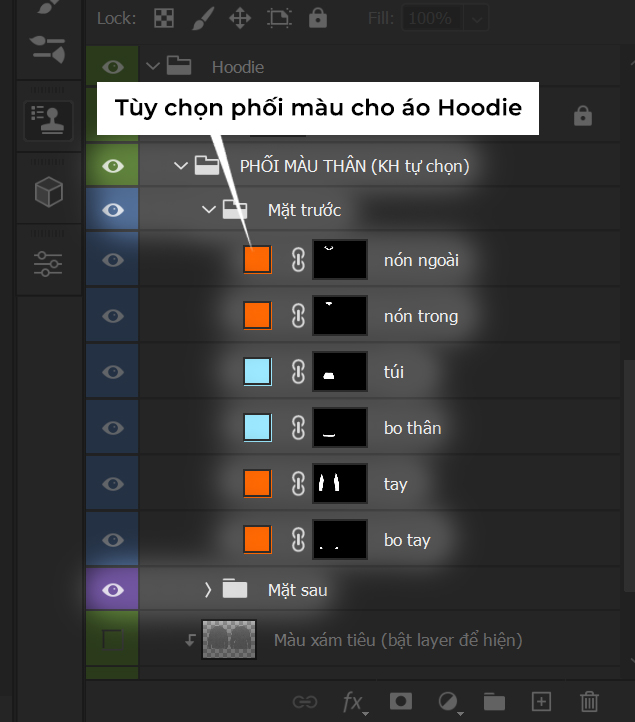 Đối với áo Hoodie, có khá nhiều phần áo có thể phối màu sắc khác nhau, bạn hãy xổ các folder ra để thay đổi màu nhé.