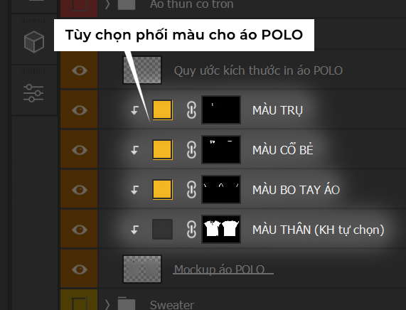 Đối với loại áo Polo và Hoodie, bạn có thể tùy chỉnh màu sắc của các phần thân áo. Nếu không cần phối thêm màu cho áo hoặc đặt các loại áo khác, bạn có thể bỏ qua bước này.