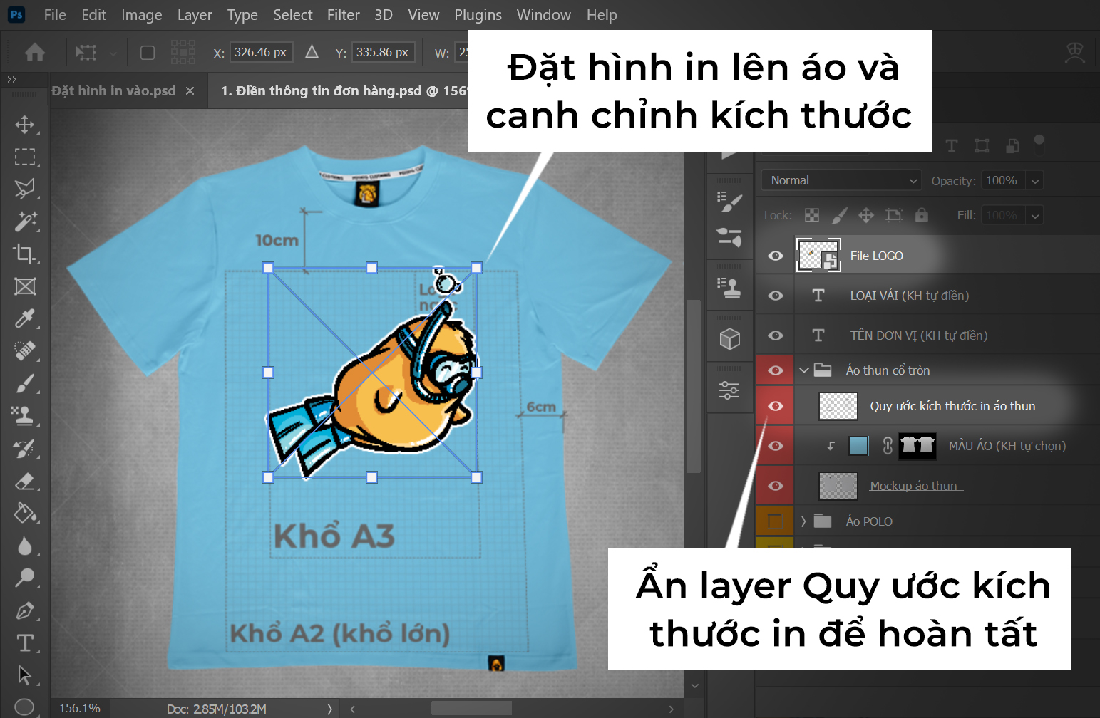 Canh chỉnh lại vị trí hình in xong rồi thì bạn hãy ẩn layer "Quy ước kích thước in" để hoàn thành diện mạo cuối cùng.