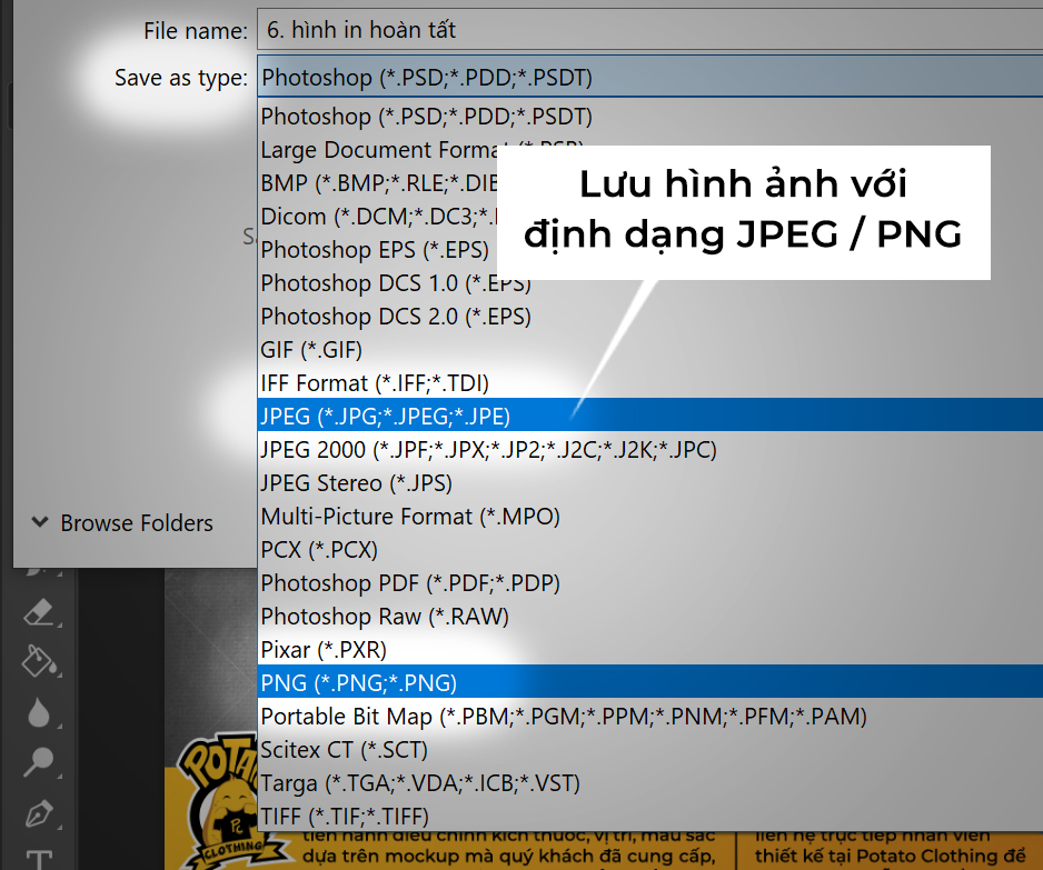 Để gửi hình thiết kế cho Potato Clothing, bạn hãy lưu file dưới dạng file PJEG hoặc PNG nhé.