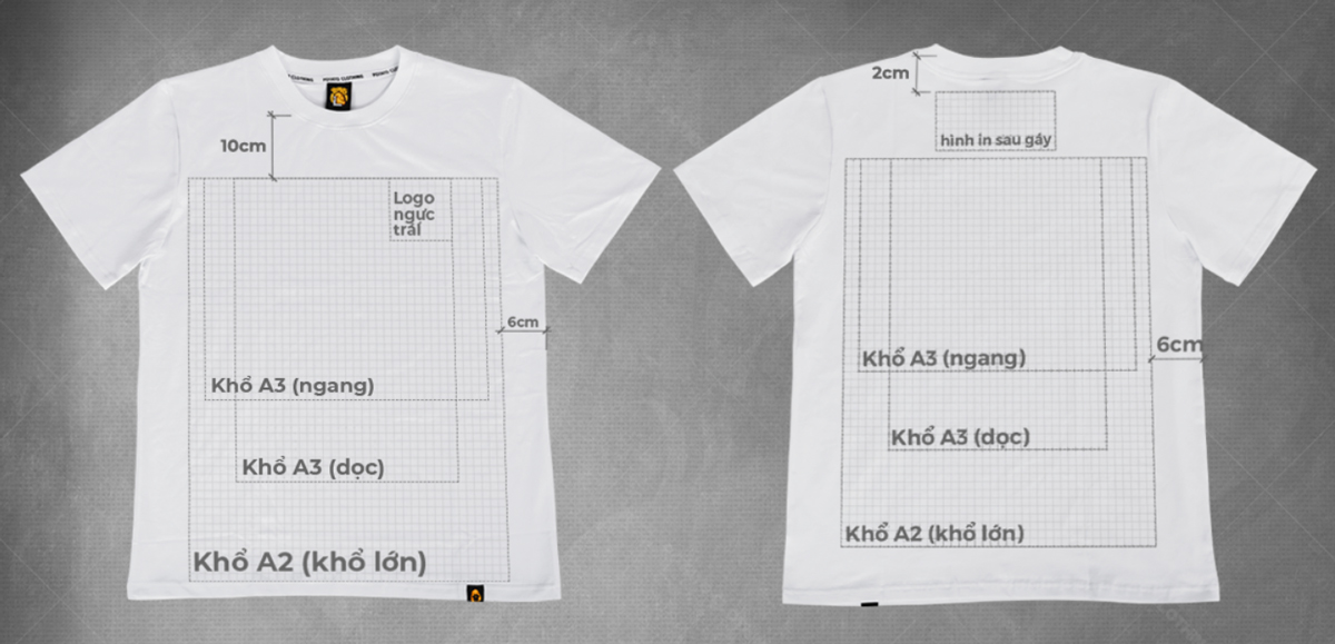 Trước khi thêm hình in lên áo, bạn cần để ý kỹ “Quy ước kích thước in”. Khi thiết kế nằm trong vùng này, hình in sẽ được gia công thuận tiện và thẩm mỹ nhất.