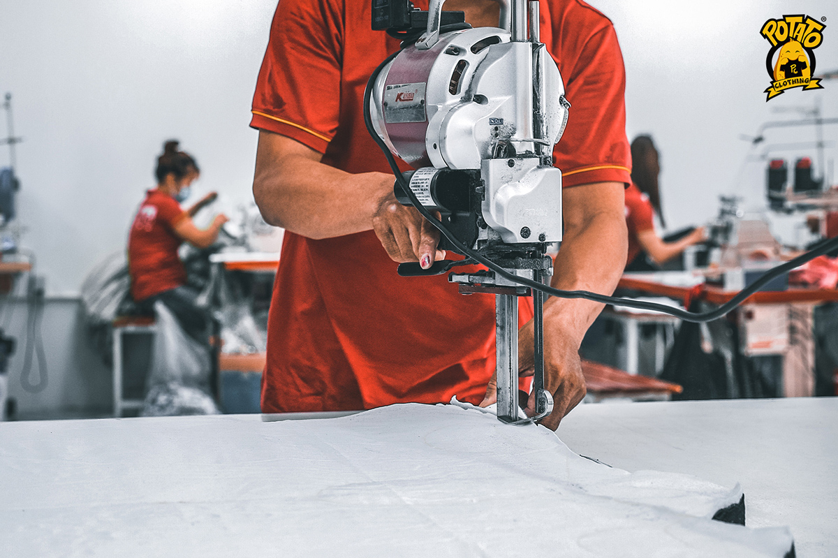 Để từ những cây vải đã được lựa chọn tỉ mỉ trở thành những chiếc áo thì đầu tiên sẽ là công đoạn cắt vải. Với mỗi form áo khác nhau, chúng tôi sẽ cắt áo theo từng rập tương ứng.