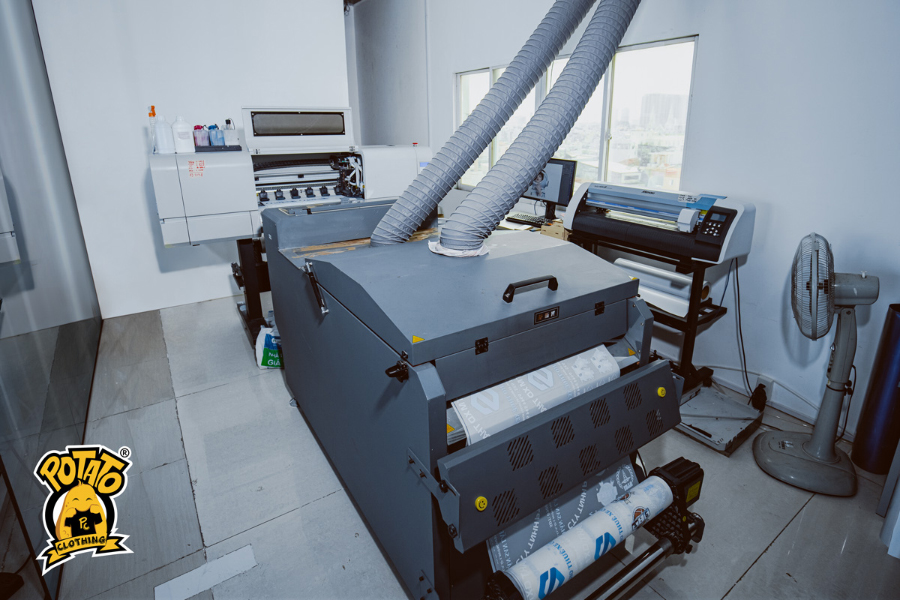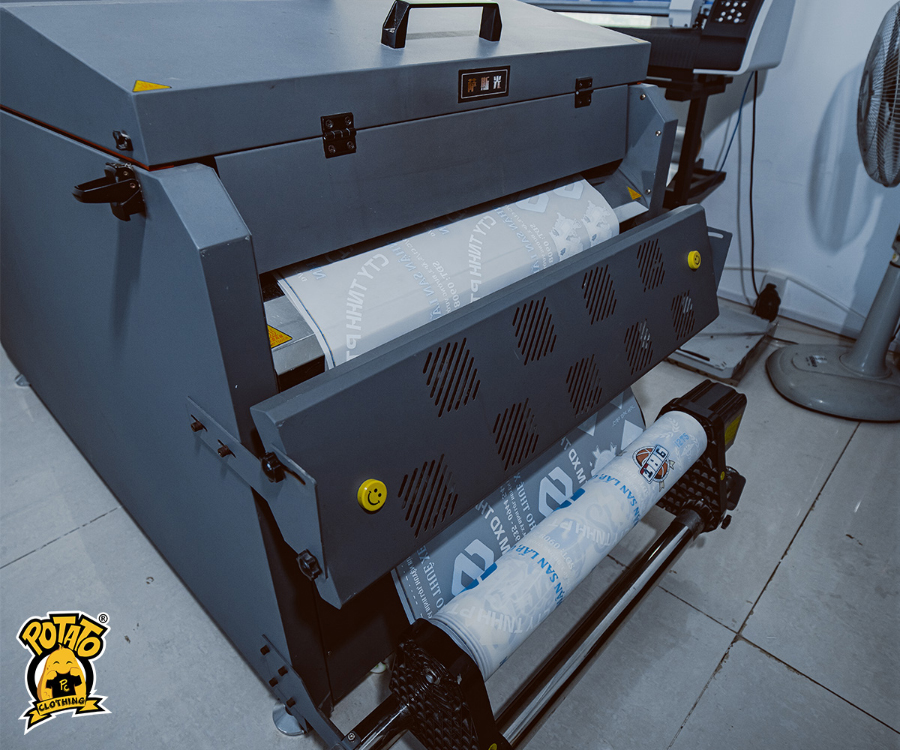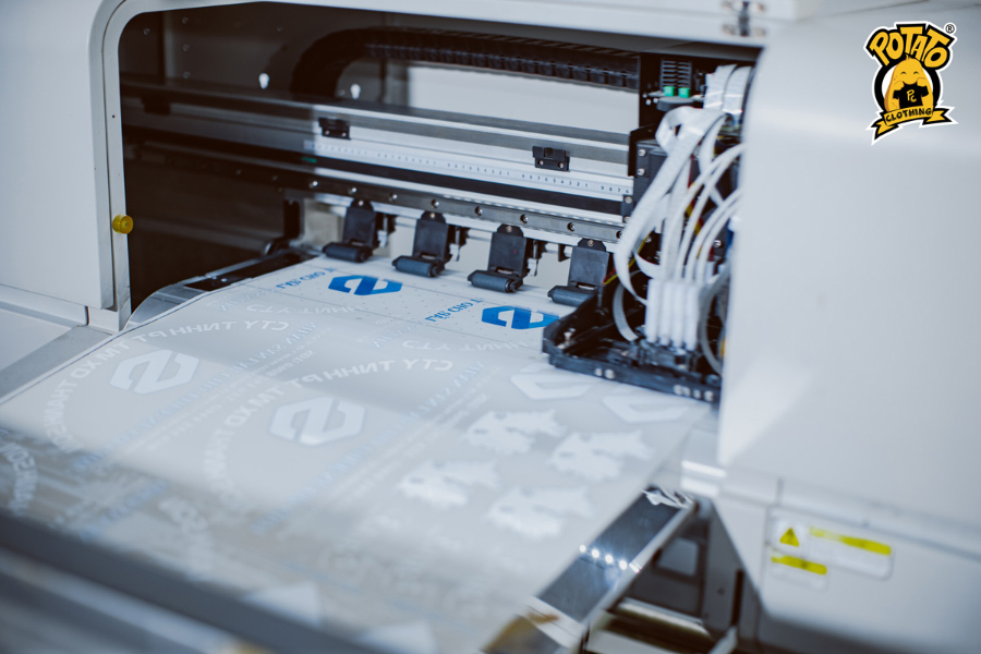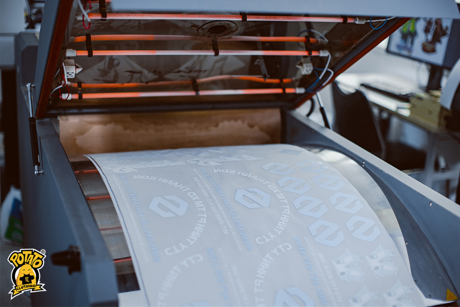 Máy in tiến hành in trực tiếp hình ảnh lên tấm màng PET. Quá trình này gồm hai lớp: lớp màu in chính được in trước, sau đó phủ thêm một lớp trắng lên trên để tạo độ sáng và rõ nét cho hình in, đặc biệt khi in trên vải tối màu.