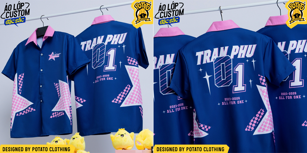 Điểm nhấn đắt giá của mẫu áo lớp sơ mi cổ casual màu xanh dương này chính là những họa tiết ngôi sao lớn phá các phía sau lưng. Đây là lựa chọn số một để team mình vừa khẳng định được sự gắn kết bền chặt, vừa thể hiện gu thời trang "độc bản" mỗi khi xuất hiện cùng nhau.
