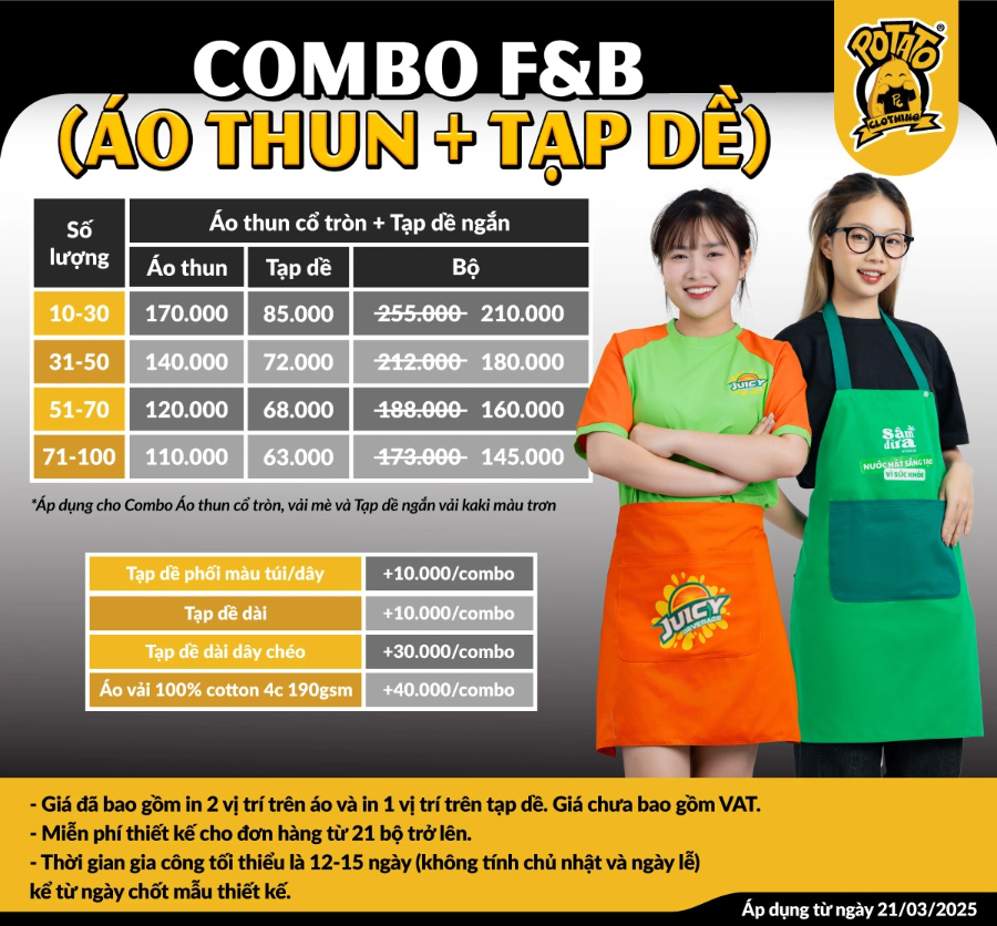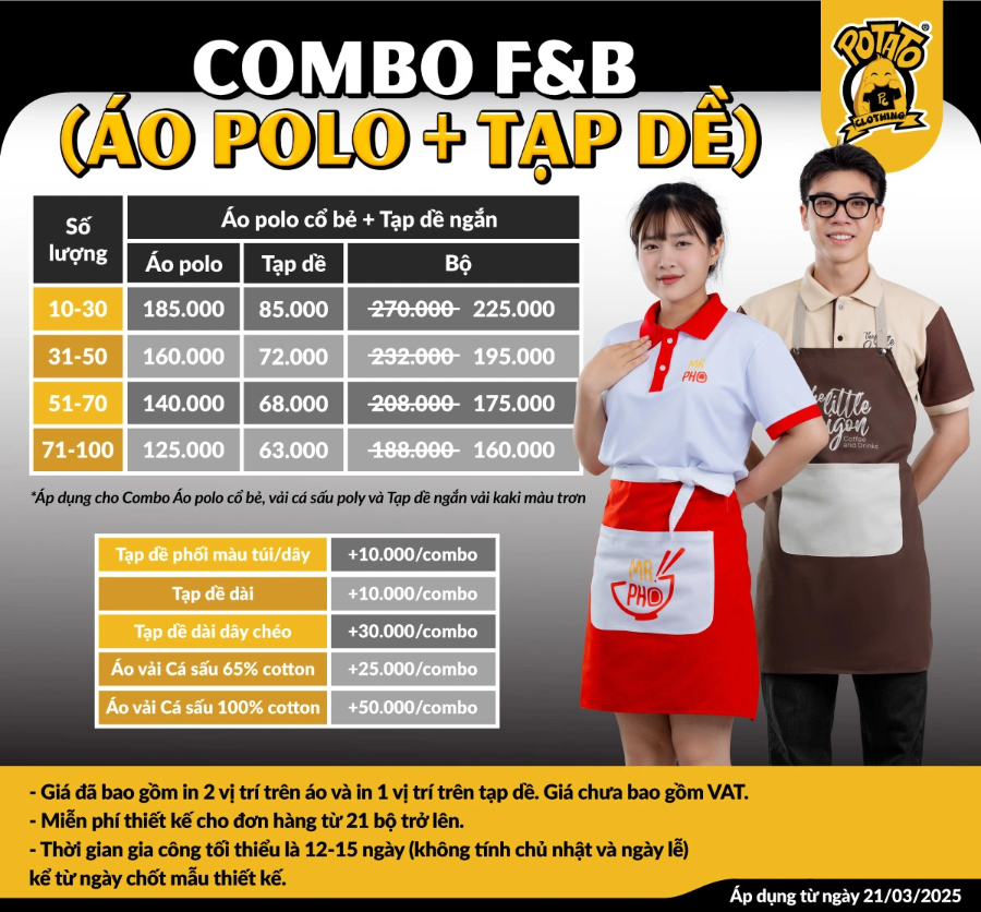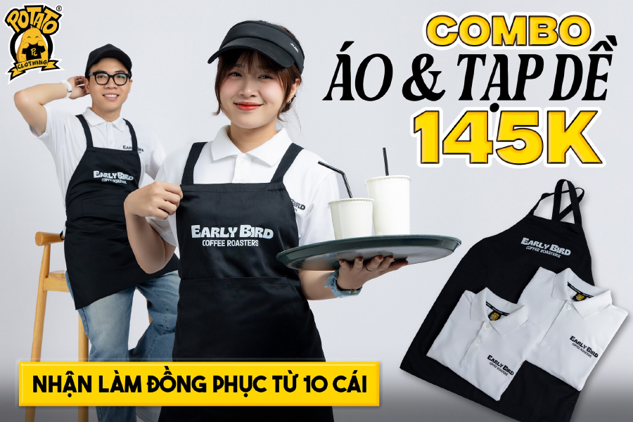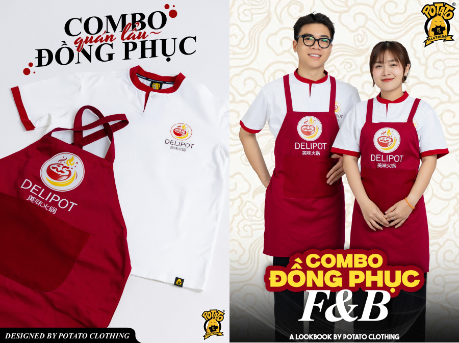 Combo Đồng Phục F&B của Potato Clothing là lựa chọn hoàn hảo cho các nhà hàng, quán ăn, quán cafe mong muốn nâng tầm hình ảnh. Gói ưu đãi này bao gồm đồng phục áo thun/áo polo) cùng với tạp dề đồng bộ, được thiết kế và in/thêu logo theo yêu cầu riêng của bạn. Đảm bảo đội ngũ của bạn luôn chuyên nghiệp và tạo ấn tượng mạnh mẽ ngay từ cái nhìn đầu tiên.