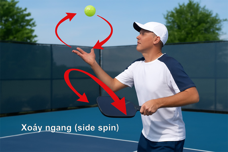 - Xoáy ngang (side spin): khiến bóng bay lệch sang trái hoặc phải.