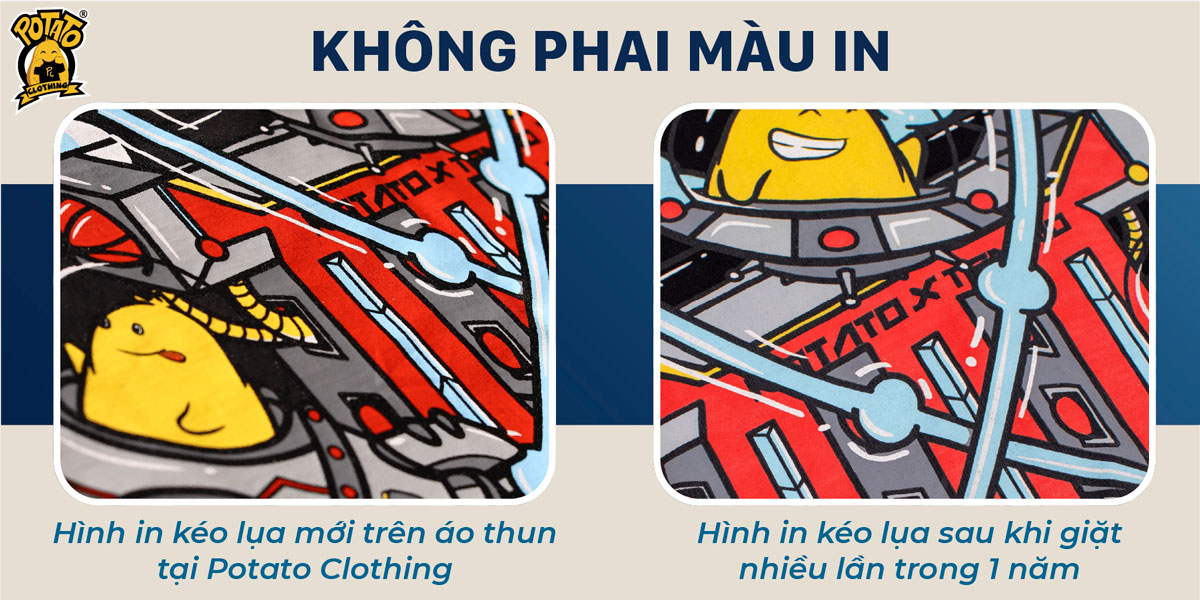 Với chất lượng mực in cao cấp, hình in trên áo thun tại Potato Clothing giữ màu rất tốt, không bị nhiễm màu, không bị thâm kim. Ngoài ra, độ bền màu của hình in cũng rất cao, không bị phai màu sau nhiều lần giặt.