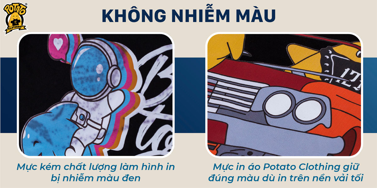 Potato Clothing sử dụng chất liệu màu in cao cấp, với nhiều công nghệ in phù hợp với từng kiểu thiết kế khác nhau, mang đến độ dẻo cùng độ bám cao cho hình in, giúp hình in co dãn theo bề mặt vải áo, không nứt, không bong tróc.