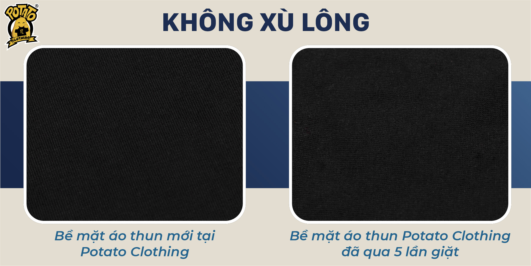 Đa số các chất liệu vải sẽ bắt đầu xù lông dần trong quá trình sử dụng do bề mặt vải gặp ma sát khi hoạt động hàng ngày và giặt giũ. Tuy nhiên, hiện tượng vải bị xù lông cũng có 1 nguyên nhân rất lớn bắt nguồn từ cách dệt vải. Vải Cotton 4 chiều 100% tại Potato Clothing được dệt với quy trình chỉnh chu, tỉ mỉ, mật độ vải cao, hạn chế hiện tượng xù lông áo thun trong quá trình mặc.