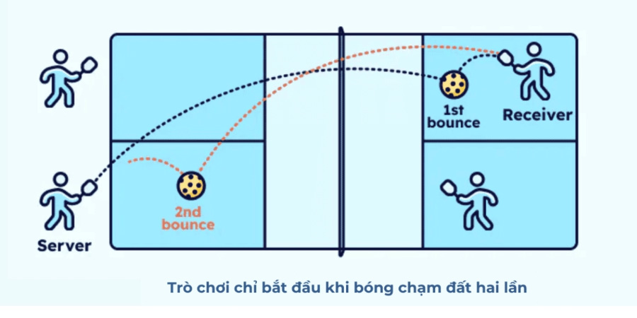 - Khi giao bóng: Người giao đứng sau vạch cuối sân, trong khi người còn lại đứng gần khu vực "kitchen line" (vạch không volley) để sẵn sàng xử lý các tình huống tiếp theo.