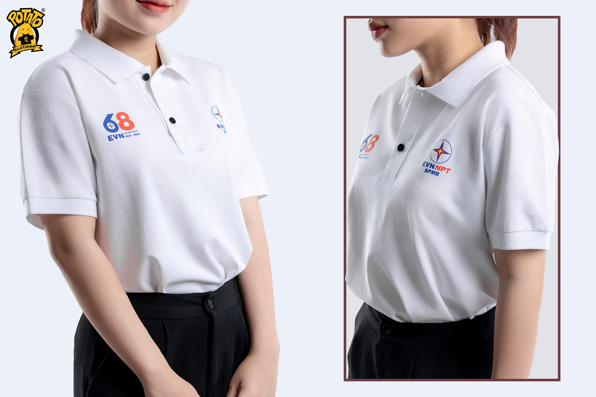 Đây là mẫu áo EVN kỷ niệm 68 năm Ngày truyền thống ngành Điện lực Việt Nam mà Potato đã làm. Áo polo trắng vải cá sấu 100% cotton, với hình in logo nhỏ trước ngực làm nổi bật lên sự kiện của doanh nghiệp.