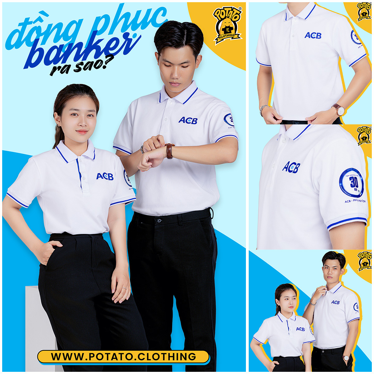Chỉnh chu, tươi sáng với áo doanh nghiệp của Ngân Hàng ACB. Chất liệu vải cá sấu 65% cotton, với thiết kế trắng áo màu trắng là chủ đạo, kết hợp với bo tay trắng sọc bích, tạo điểm nhấn cho chiếc áo bớt nhàm chán.
