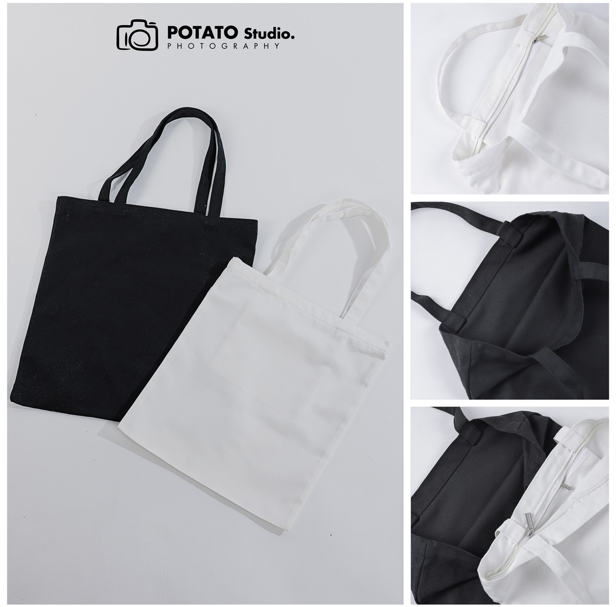 Túi vải của Potato có kích thước là 33x38cm; với 3 màu: trắng, kem, đen; miệng túi trơn hoặc có khóa kéo và túi con. Các bạn có thể in lên túi theo yêu cầu, hình in không giới hạn màu sắc.