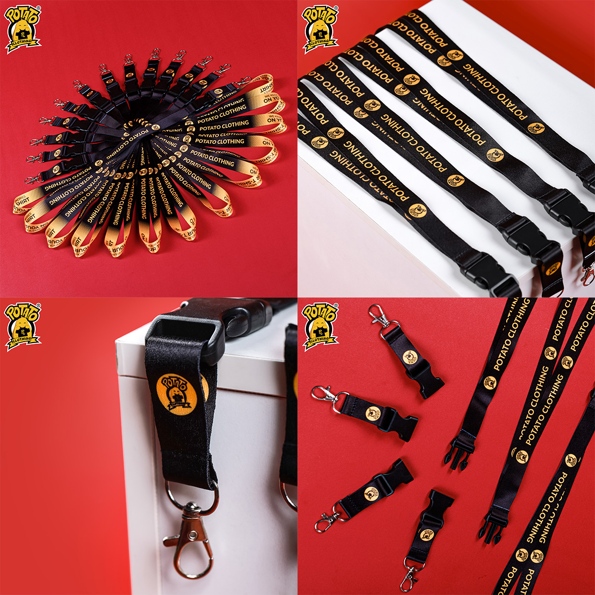 Ở Potato Clothing, dây đeo được làm từ chất liệu Satin với phương pháp in chuyển nhiệt, có thể in được tất cả các thiết kế, không giới hạn số màu. Tuy nhiên, do kích thước dây đeo nhỏ nên không in được những hình in quá chi tiết, mà chỉ in được những họa tiết nét to vừa phải, đơn giản.