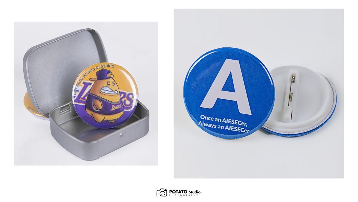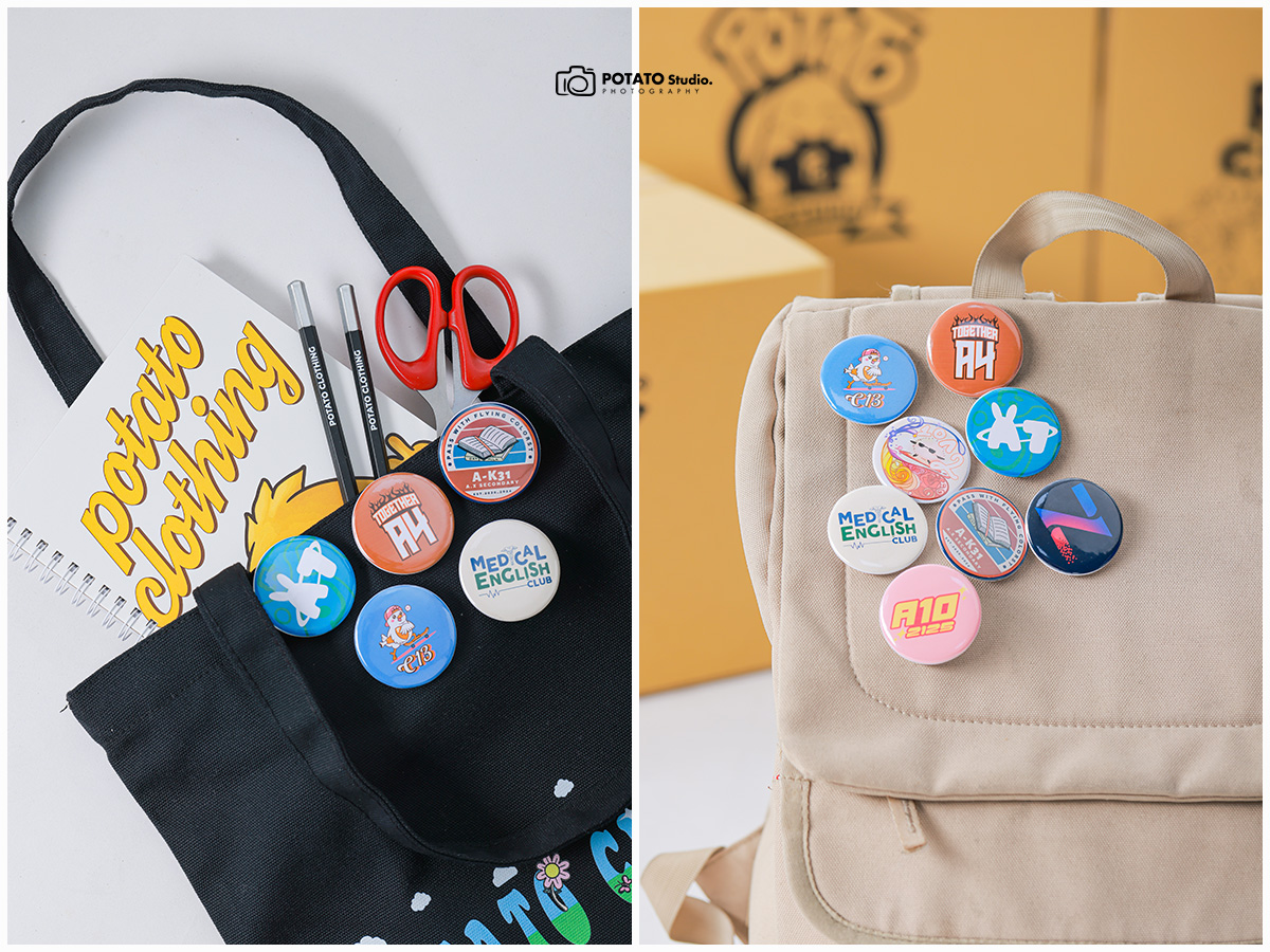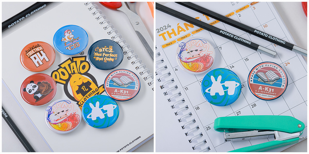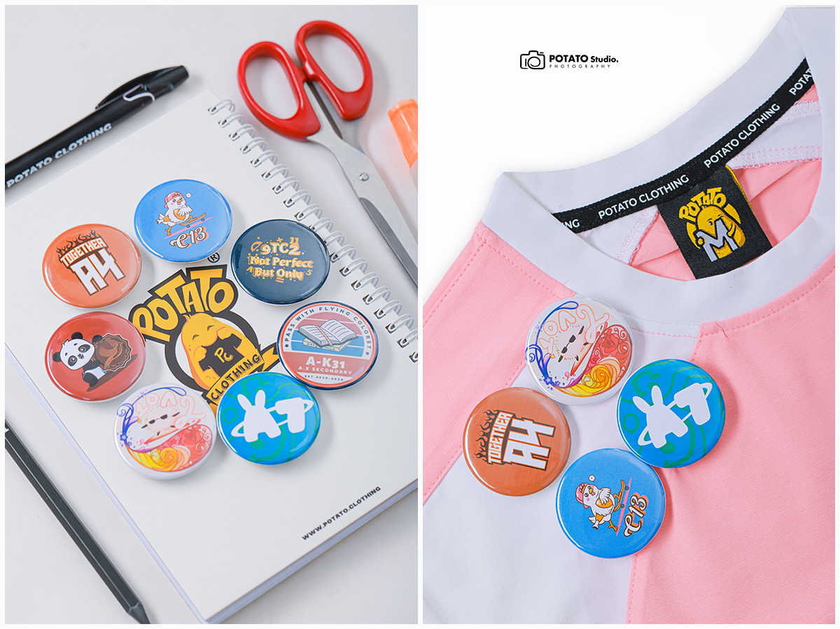 Potato Clothing cung cấp huy hiệu tròn, chất liệu nhựa với đường kính là 4,4cm. Mọi người có thể in nội dung theo ý thích, không giới hạn màu sắc. Huy hiệu của Potato được bọc một lớp màng bóng bên ngoài nên không thấm nước và hình in trên huy hiệu cũng tươi tắn hơn.