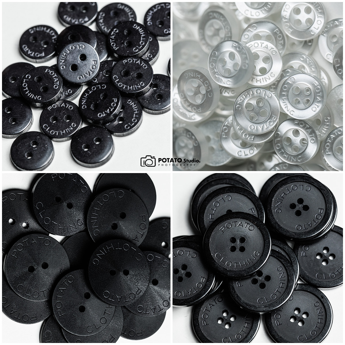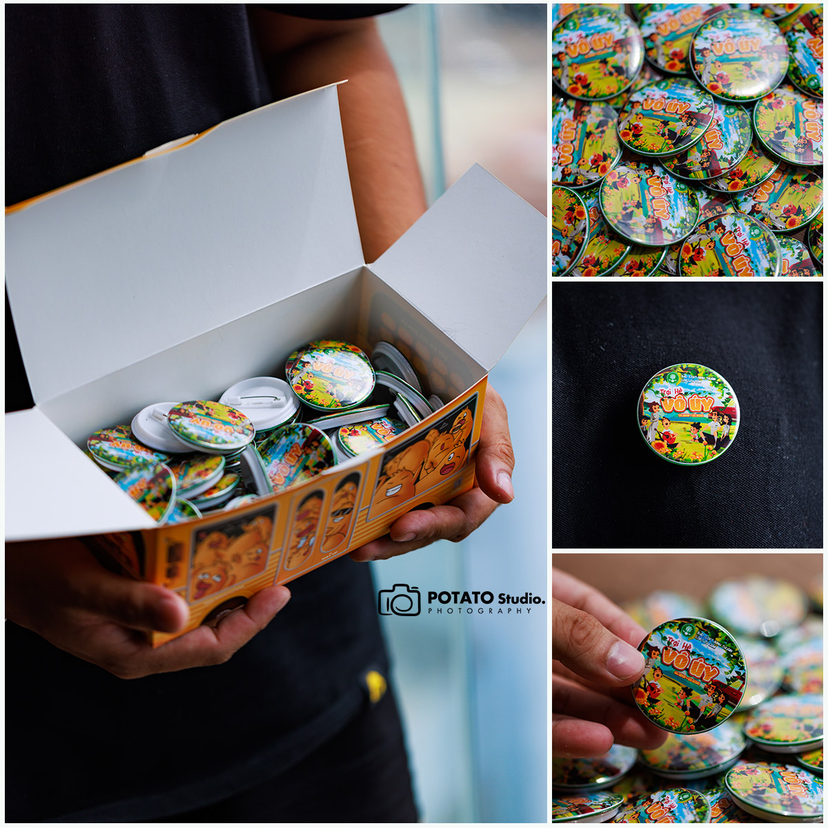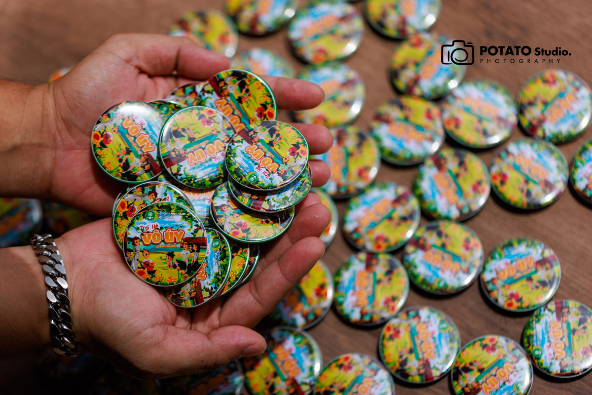 Potato Clothing cung cấp huy hiệu tròn, chất liệu nhựa với đường kính là 4,4cm. Mọi người có thể in nội dung theo ý thích, không giới hạn màu sắc. Huy hiệu của Potato được bọc một lớp màng bóng bên ngoài nên không thấm nước và hình in trên huy hiệu cũng tươi tắn hơn.