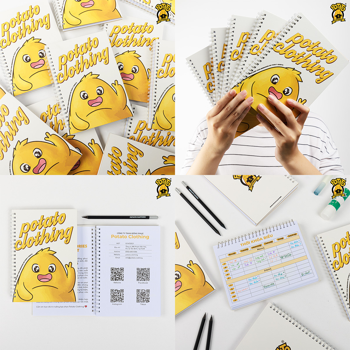 Ở Potato Clothing có những mẫu sổ tay khác nhau cho bạn lựa chọn như sổ tay lò xo, sổ tay bằng chỉ khâu… với nhiều loại giấy chất lượng, kích thước khổ A5 hoặc A4.